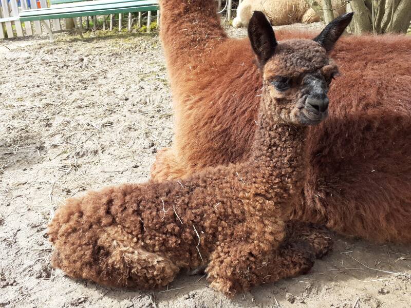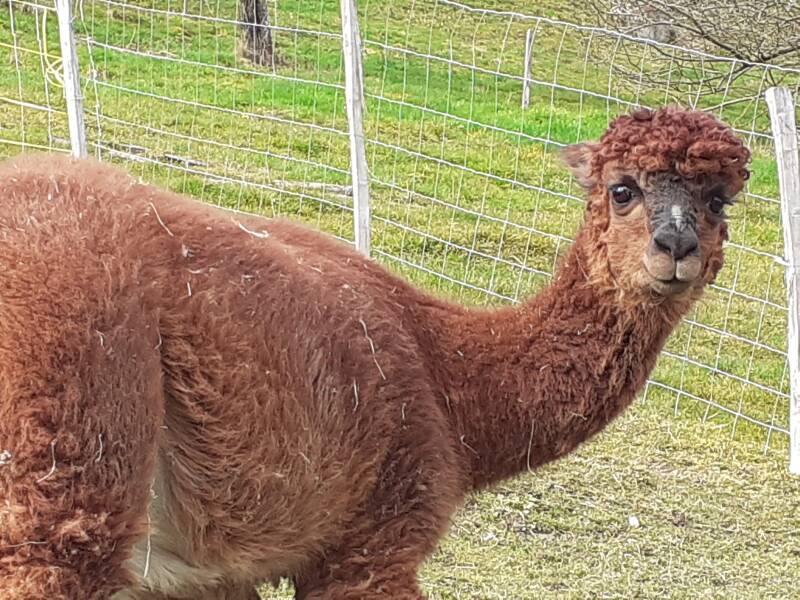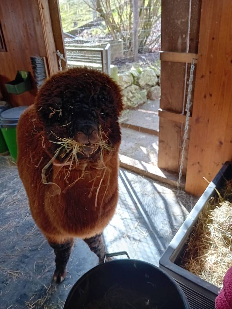 Pepper ist tragend zu uns gezogen und hat uns im Frühling 2023 unser erstes Alpaka-Cria geschenkt. Sie ist ein super Mami. Pepper vertraut uns sehr. Sie weiss genau, dass wir Menschen ihr gut gesinnt sind und ihr nur helfen wollen, wenn sich zum Beispiel etwas im Fell verfangen hat oder so. Sie lässt sich dann problemlos helfen. Pepper hat von allen die coolste Frisur mit ihren vielen Chruseli auf dem Kopf :) Bei Besuchern kommt das besonders gut an :) Auch Pepper geht gerne mit auf einen Spaziergang. Auch das 2. Cria von Pepper ist ein Hengstli :) Der kleine Aramis ist ein absolut liebes Alpaka.