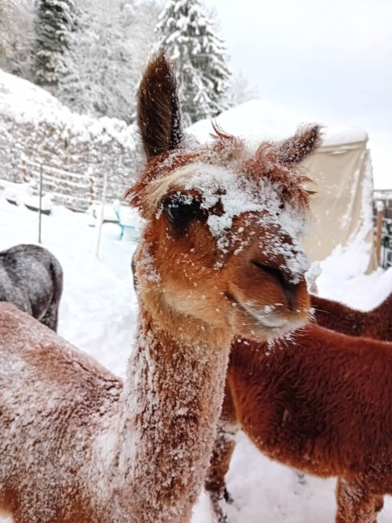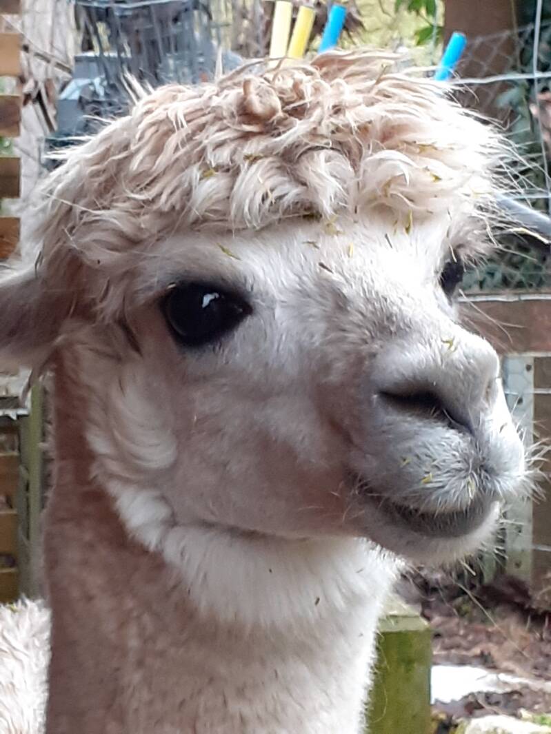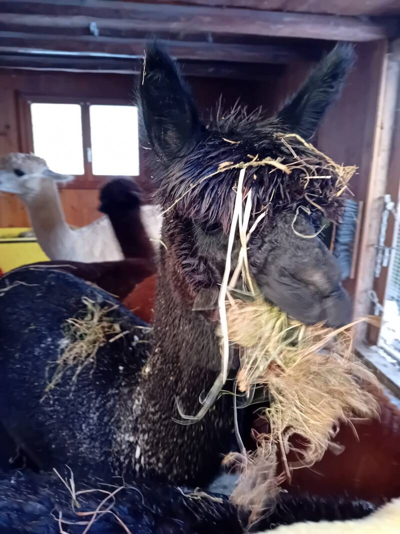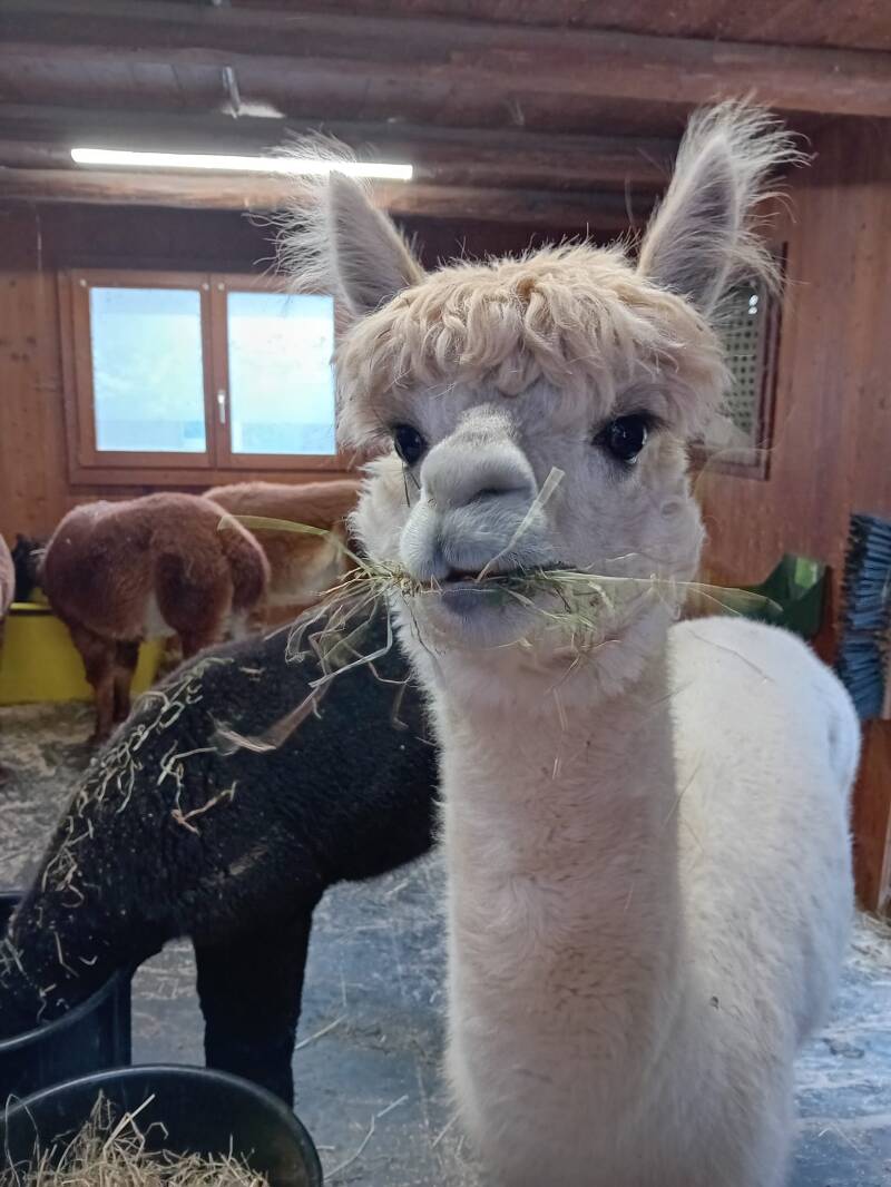 Solay haben wir im November 2023 in einem Inserat entdeckt, und uns sofort in die Schönheit verliebt. Die helle Farbe ihres Vliesses und die kugelrunden schwarzen Augen haben es uns sofort angetan. Da auch sie aus einem Tuberkulose überwachten Betrieb kommt, stand nach einem ersten Besichtigen nichts mehr im Weg, dass sie bei uns einziehen durfte. Willkommen wunderschöne Solay in unserer Alpaka-Herde.